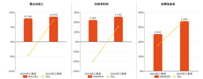 公司营业总收入为16.94亿元。归母净利润为5.19亿元。经营活动现金净流入为6.49亿元。