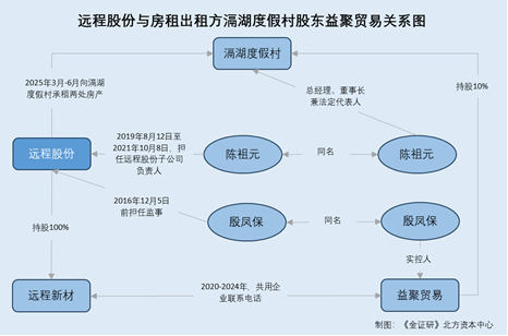此次定增,远程股份在其募集说明书披露,2025年3月-6月,其向滆湖度假村承租房产。官宣显示陈祖元系滆湖度假村总经理。而回溯历史,远程股份上市前曾持有滆湖度假村10%的股权。且同名的“陈祖元”曾在2019-2021年任远程股份子公司宜兴远辉负责人。滆湖度假村的股东益聚贸易的实控人为殷凤保,与远程股份原监事同名。而2020-2024年,远程股份子公司远程新材与益聚贸易共用联系电话,或上演经营混淆异象。