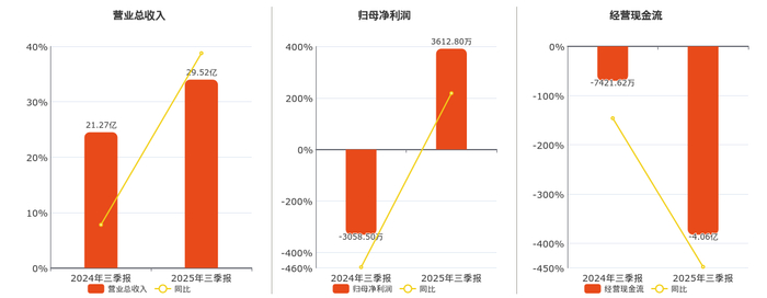 公司营业总收入为29.52亿元,较去年同报告期营业总收入增加8.25亿元,实现2年连续上涨,同比较去年同期上涨38.77%。归母净利润为3612.80万元,较去年同报告期归母净利润增加6671.30万元。经营活动现金净流入为-4.06亿元。