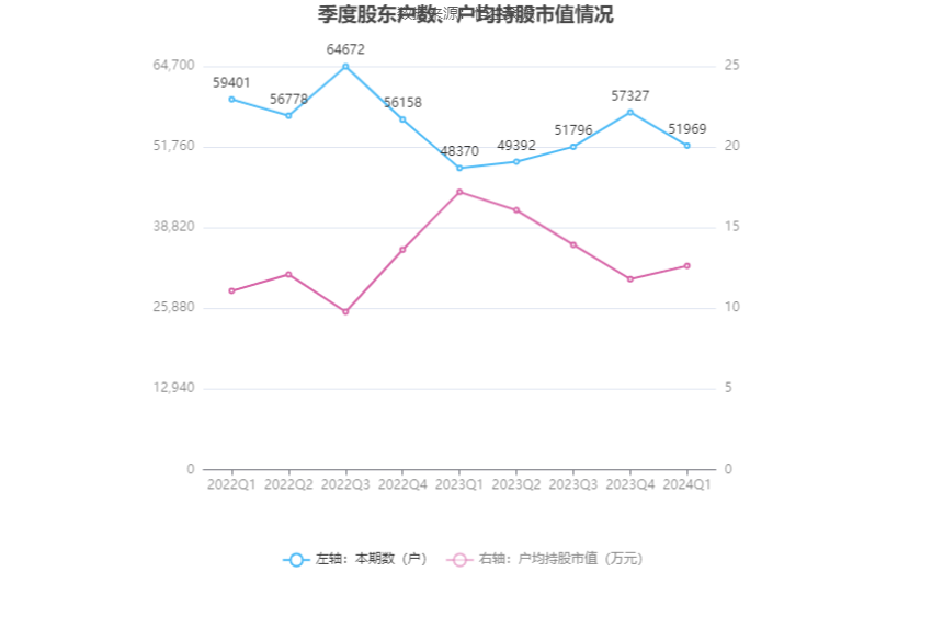 筹码集中度方面,截至2024年一季度末,公司股东总户数为5.2万户,较上年末下降了5358户,降幅9.35%;户均持股市值由上年末的11.81万元上升至12.64万元,增幅为7.03%。
