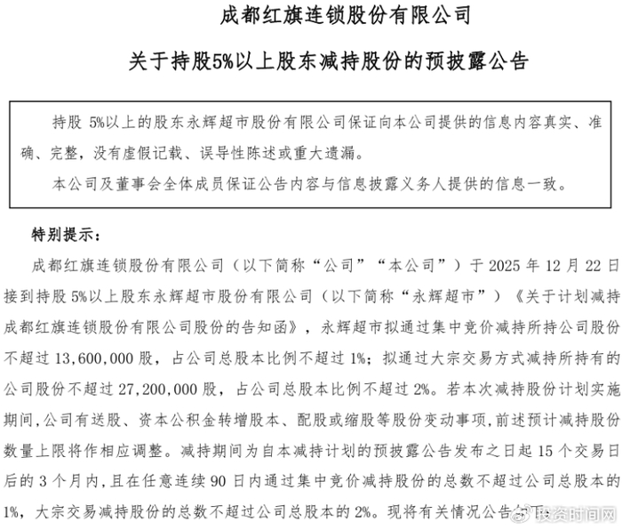 12月23日,红旗连锁(002697.SZ)发布股东减持预披露公告称,永辉超市(601933.SH)计划自公告发布之日起15个交易日后的3个月内,通过集中竞价方式减持不超过1360万股(占公司总股本的1%),通过大宗交易方式减持不超过2720万股(占公司总股本的2%)。