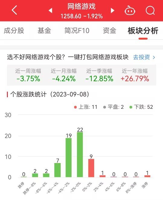 中国经济网北京9月8日讯今日,网络游戏板块整体跌幅1.92%,其中11只股票上涨,2只股票平盘,52只股票下跌。