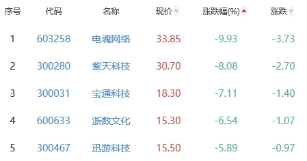 电魂网络、紫天科技(维权)、宝通科技、浙数文化、迅游科技位列涨幅榜后五位,涨幅分别为-9.93%、-8.08%、-7.11%、-6.54%、-5.89%。