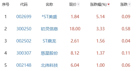其中,*ST美盛(维权)、初灵信息、ST鼎龙(维权)、慈星股份(维权)、北纬科技位列板块涨幅前五位,涨幅分别为5.14%、3.33%、1.56%、1.37%、1.00%。