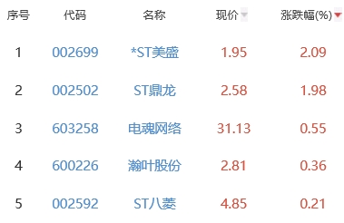 其中,*ST美盛、ST鼎龙、电魂网络、瀚叶股份、ST八菱位列板块涨幅前五位,涨幅分别为2.09%、1.98%、0.55%、0.36%、0.21%。
