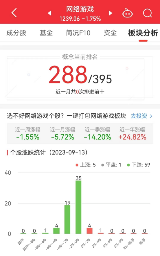 中国经济网北京9月13日讯今日,网络游戏板块整体涨幅-1.75%,其中5只股票上涨,1只股票平盘,59只股票下跌。