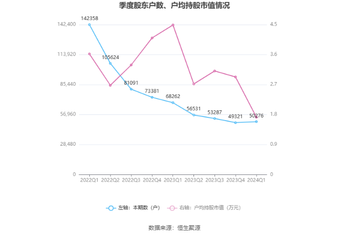 筹码集中度方面,截至2024年一季度末,公司股东总户数为5.03万户,较上年末增长了955户,增幅1.94%;户均持股市值由上年末的2.93万元下降至1.72万元,降幅为41.30%。