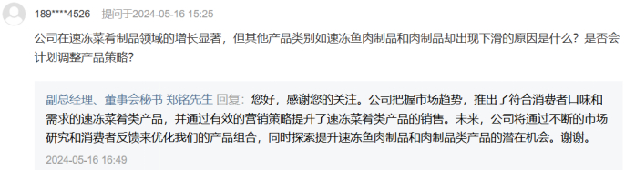 证券之星注意到,在公司召开的2023年年度业绩说明会中,有投资者询问冻鱼肉制品和肉制品却出现下滑的原因,但公司管理层未予以正面回应。