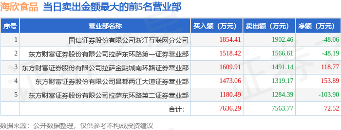 12月25日海欣食品(002702)龙虎榜数据:机构净买入2284.8万元