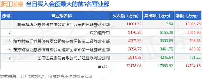 1月13日浙江世宝(002703)龙虎榜数据:北向资金净买入3004.98万元