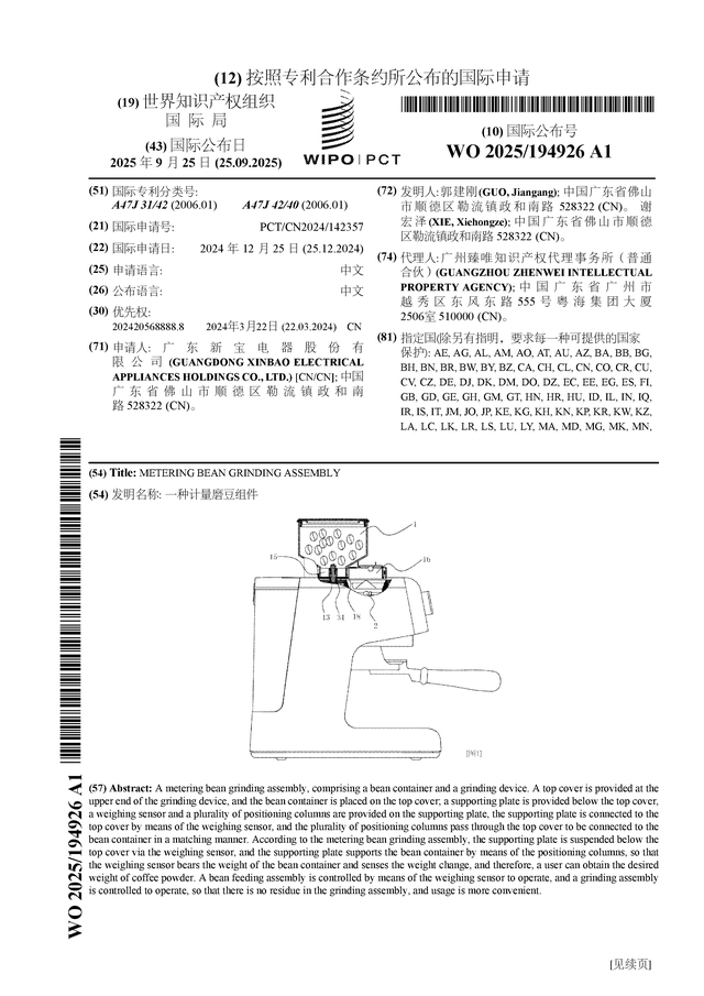 新宝股份公布国际专利申请:“一种计量磨豆组件”