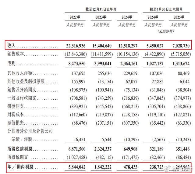 尽管如此,公司近年业绩明显承压。《招股说明书》显示,2022至2025年6月底(以下简称:报告期),天赐材料的营收分别为223.17亿元、154.05亿元、125.18亿元和70.29亿元,相应的净利润分别为人民币58.44亿元、18.42亿元、4.78亿元和2.65亿元。2024年净利润相较2022年下降91.8%,显示出行业周期性调整带来的盈利压力正持续加剧。