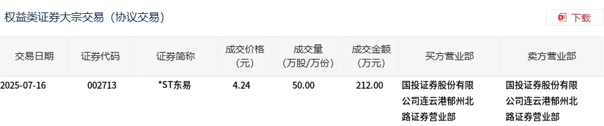 *ST东易今日大宗交易折价成交50万股,成交额212万元