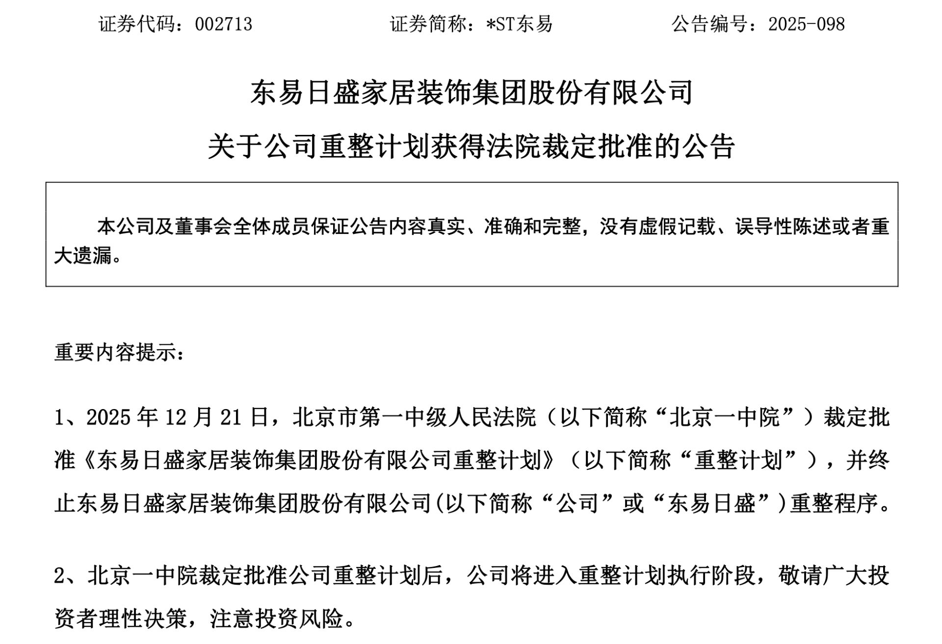 12月21日晚间,*ST东易(002713.SZ)公告,当日,公司收到北京一中院送达的(2025)京01破501号《民事裁定书》。北京一中院裁定批准《东易日盛家居装饰集团股份有限公司重整计划》,并终止公司重整程序。