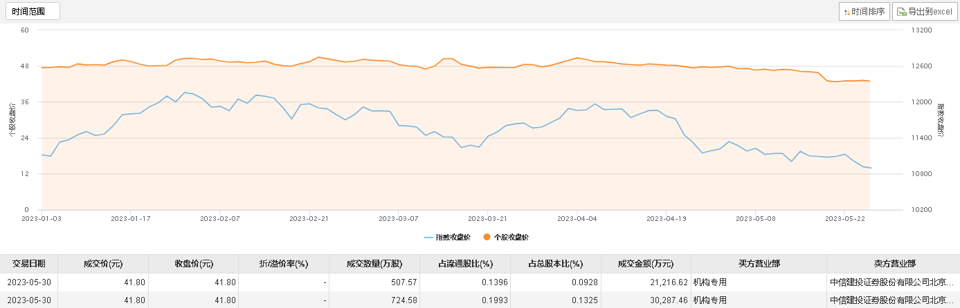 5月30日大宗交易成交1232.15万股,成交额5.15亿元,占当日总成交额的43.05%,成交价41.8元,较市场收盘价41.8元持平。