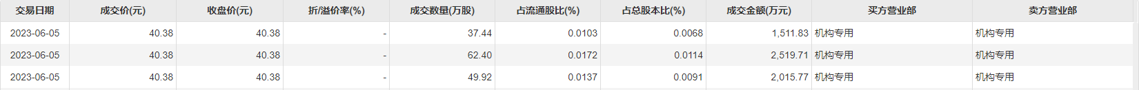 6月5日大宗交易成交149.76万股,成交额6047.31万元,占当日总成交额的8.78%,成交价40.38元,较市场收盘价40.38元持平。