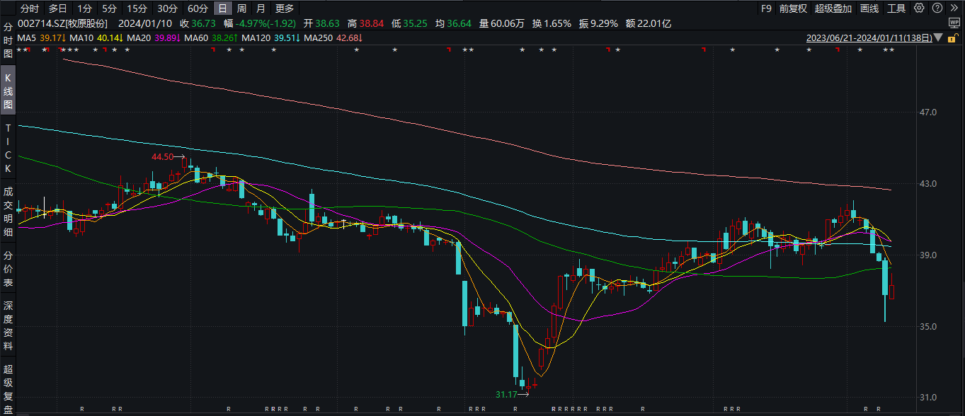 在经历1月10日股价下跌4.97%,牧原股份股价在今日迎来反弹。