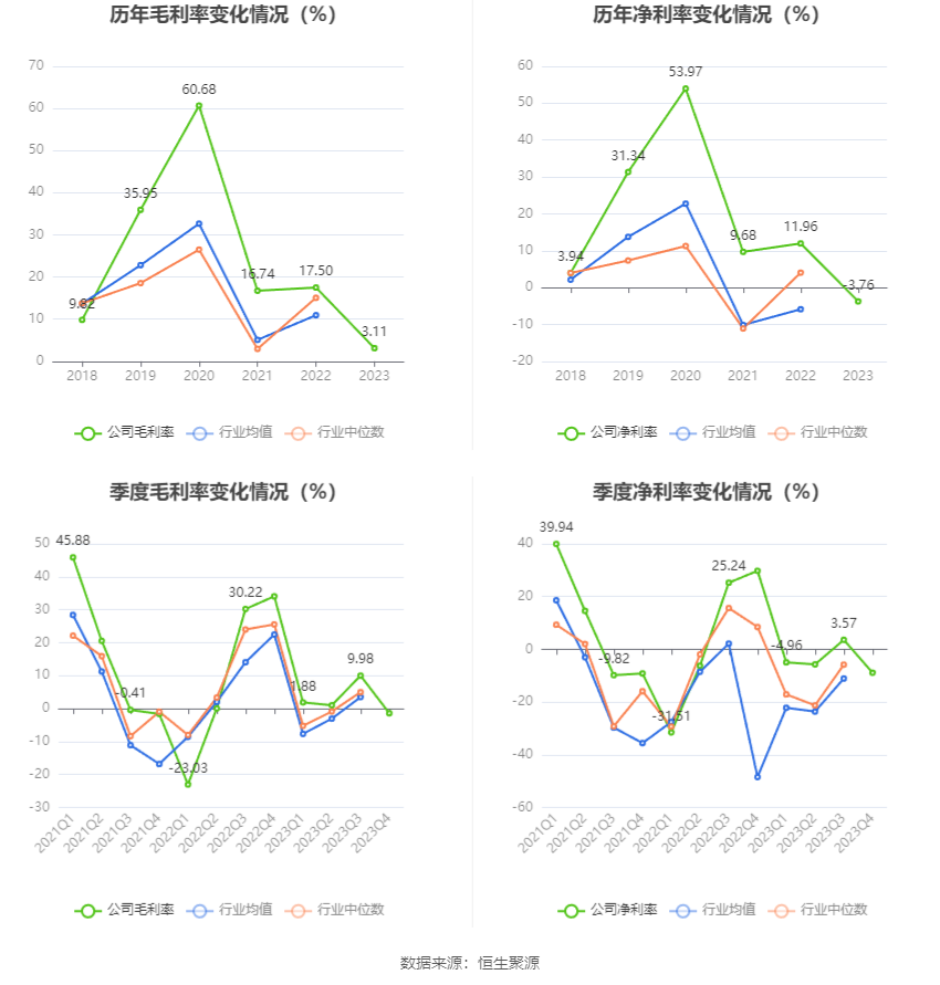2023年,公司毛利率为3.11%,同比下降14.39个百分点;净利率为-3.76%,较上年同期下降15.72个百分点。从单季度指标来看,2023年第四季度公司毛利率为-1.41%,同比下降35.47个百分点,环比下降11.39个百分点;净利率为-8.92%,较上年同期下降38.68个百分点,较上一季度下降12.49个百分点。