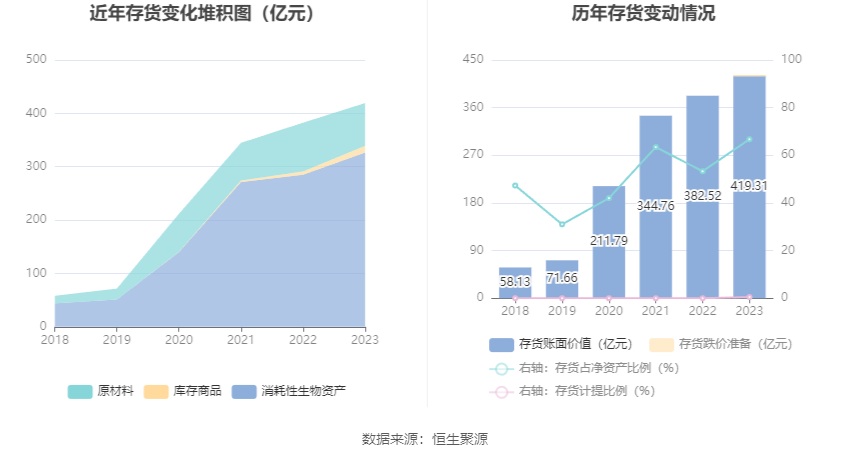 从存货变动来看,截至2023年年末,公司存货账面价值为419.31亿元,占净资产的66.74%。其中,存货跌价准备为2.02亿元,计提比例为0.48%。