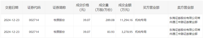 牧原股份今日大宗交易成交373.01万股,成交额1.46亿元
