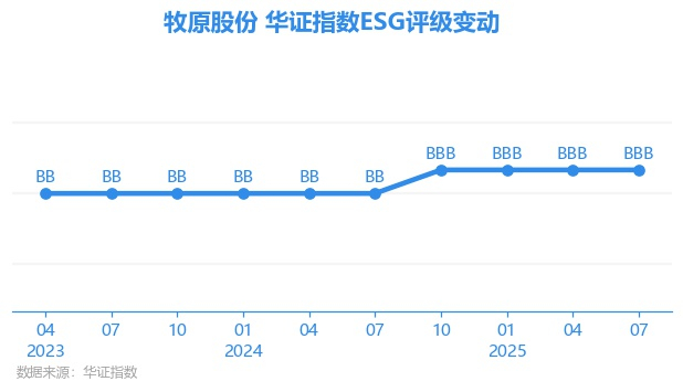 日前,华证指数公布了新一期(2025年7月31日)的ESG评级结果,牧原股份(002714.SZ)获得BBB评级(华证指数评级为C起至AAA九档,C为最低档,AAA为其最高一级评级/AA为其第二档),上一期(2025年4月30日)ESG评级为BBB。本期ESG评级在156家食品行业A股上市公司中排名第17(上一期排名第15)。