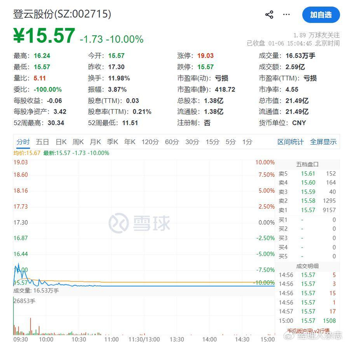Wind数据显示,截至1月6日收盘,登云股份股价报15.57元/股,跌幅为10%,市值约21.49亿元。实控人被批准逮捕 未在公司担任董高职务