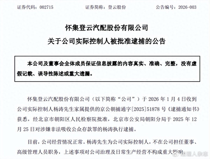 登云股份公告披露,公司于1月4日收到实际控制人杨涛家属提供的《逮捕通知书》,经北京市朝阳区人民检察院批准,北京市公安局朝阳分局已于2025年12月25日对涉嫌非法吸收公众存款罪的杨涛执行逮捕。