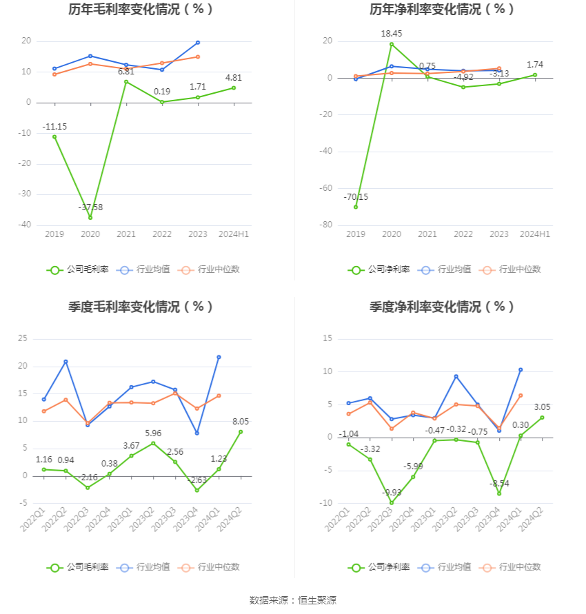 2024年上半年,公司毛利率为4.81%,同比上升0.11个百分点;净利率为1.74%,较上年同期上升2.14个百分点。从单季度指标来看,2024年第二季度公司毛利率为8.05%,同比上升2.09个百分点,环比上升6.82个百分点;净利率为3.05%,较上年同期上升3.37个百分点,较上一季度上升2.75个百分点。