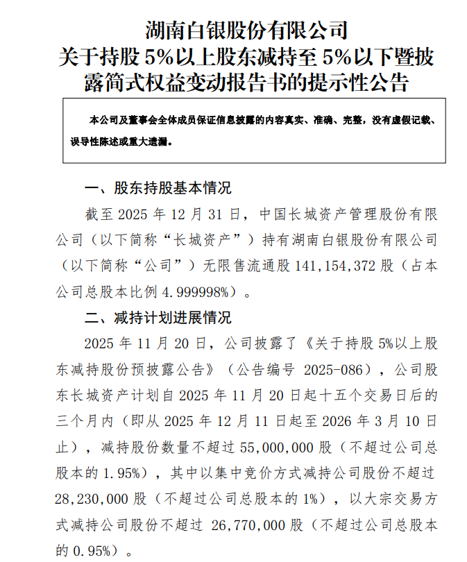 1月4日,湖南白银(002716.SZ)公告称,公司股东长城资产于2025年12月11日至30日通过集中竞价交易减持公司股份1791万股,占公司当前总股本的0.63%。减持后,长城资产持有公司1.41亿股,占公司总股本的4.999998%,不再是公司持股5%以上股东。此次减持符合已披露的减持计划,不会导致公司控股权变更,不会对公司治理结构、股权结构及持续经营产生重大影响。