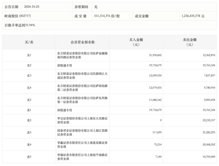 10月25日,岭南股份今日涨停,龙虎榜数据显示,上榜营业部席位全天成交2.33亿元,占当日总成交金额比例为18.86%。其中,买入金额为7771.49万元,卖出金额为1.56亿元,合计净卖出7782.32万元。
