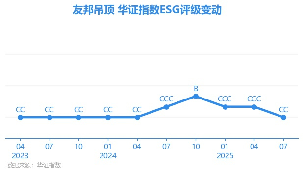 日前,华证指数公布了新一期(2025年7月31日)的ESG评级结果,友邦吊顶(002718.SZ)获得CC评级(华证指数评级为C起至AAA九档,C为最低档,AAA为其最高一级评级/AA为其第二档),上一期(2025年4月30日)ESG评级为CCC。本期ESG评级在147家家庭耐用消费品行业A股上市公司中排名第127(上一期排名第105)。