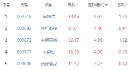 其中,麦趣尔、妙可蓝多、中炬高新、来伊份、劲仔食品位列板块涨幅前五位,涨幅分别为9.97%、4.40%、4.39%、4.00%、3.77%。