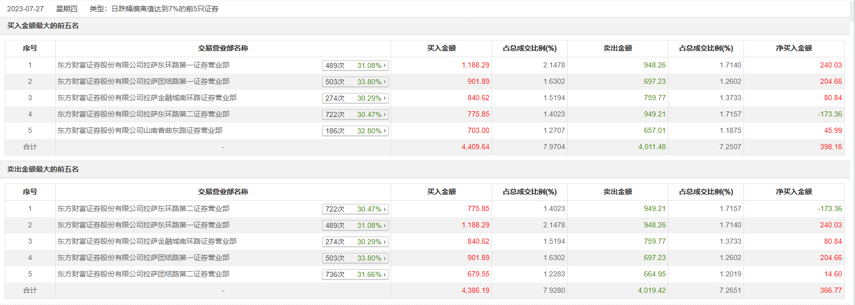 具体来看,东方财富证券拉萨东环路第二证券营业部、东方财富证券拉萨东环路第一证券营业部分别卖出949.21万元、948.26万元;东方财富证券拉萨东环路第一证券营业部、东方财富证券拉萨团结路第一证券营业部分别买入1188.29万元、901.89万元。