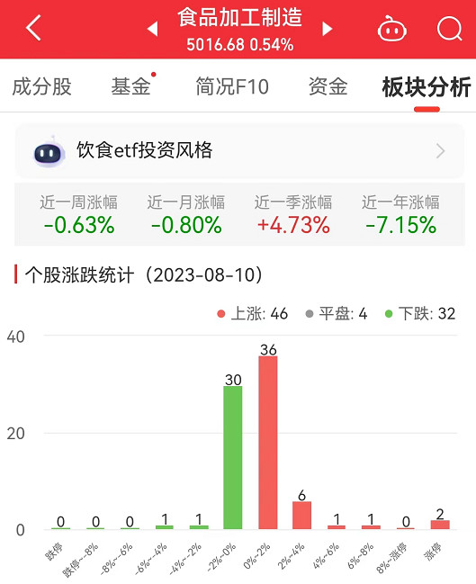中国经济网北京8月10日讯 今日,食品加工制造板块整体涨幅0.54%,其中,46只股票上涨,4只股票平盘,32只股票下跌。