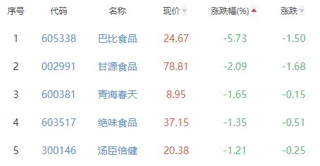 巴比食品、甘源食品、青海春天、绝味食品、汤臣倍健位列涨幅榜后五位,涨幅分别为-5.73%、-2.09%、-1.65%、-1.35%、-1.21%。