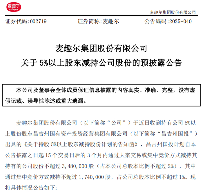 昌吉州国投是麦趣尔的国资二股东,目前持有8.13%的股份,此次如果按照上限减持,其持股比例将降至6.13%。