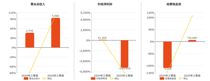 公司营业总收入为5.58亿元,较去年同报告期营业总收入增加2.81亿元,同比较去年同期上涨101.60%。归母净利润为-3781.83万元,较去年同报告期归母净利润减少3843.18万元,同比较去年同期下降6263.91%。经营活动现金净流入为776.49万元,较去年同报告期经营活动现金净流入增加1.41亿元。