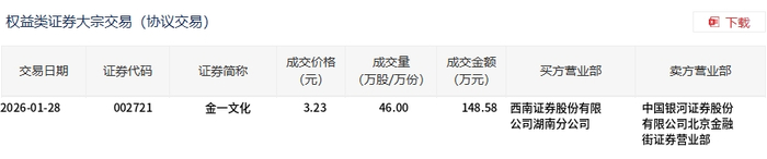 金一文化今日大宗交易折价成交46万股,成交额148.58万元