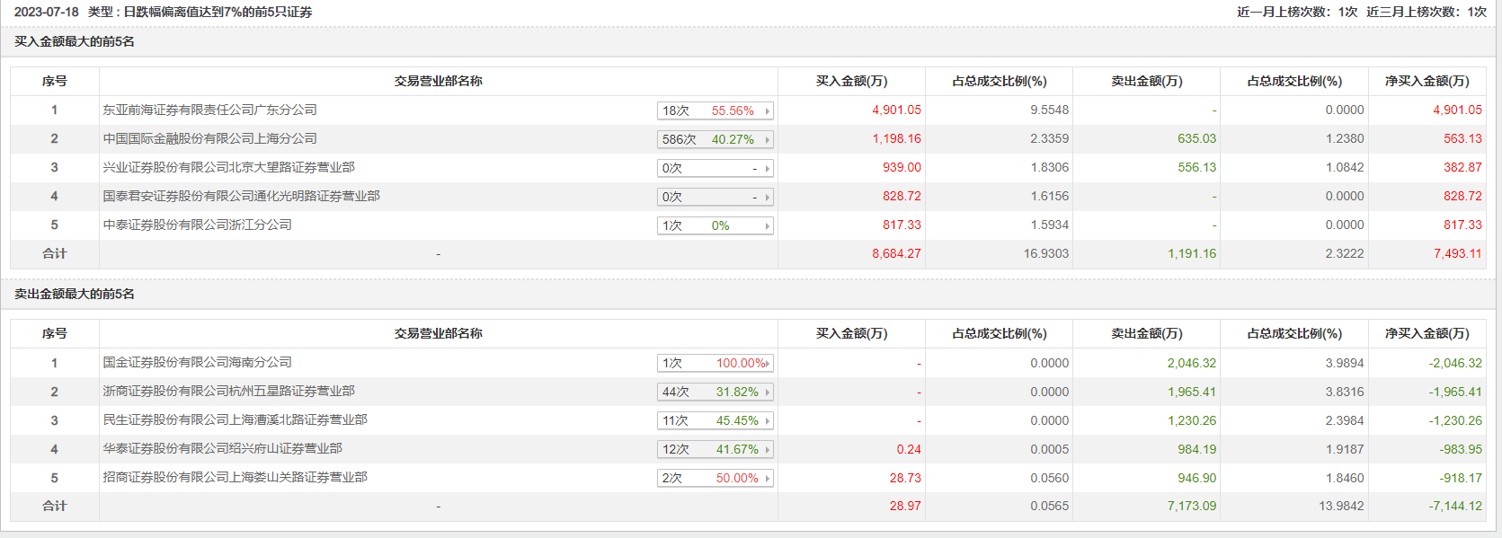 具体来看,国金证券海南分公司、浙商证券杭州五星路证券营业部分别卖出2046.32万元、1965.41万元;东亚前海证券广东分公司、中国国际金融上海分公司分别买入4901.05万元、1198.16万元。