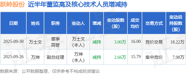 跃岭股份:9月30日高管万士文减持股份合计3万股