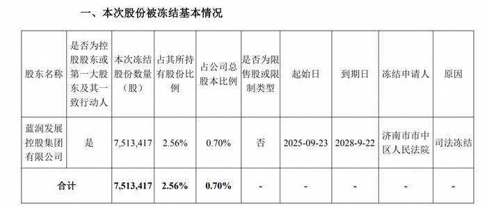 据公告披露,蓝润发展此次被司法冻结的股份数量为751万股,占其所持公司股份的2.56%,占公司总股本的0.70%。冻结起始日为2025年9月23日,到期日为2028年9月22日,冻结申请人为济南市市中区人民法院,冻结原因为司法冻结。