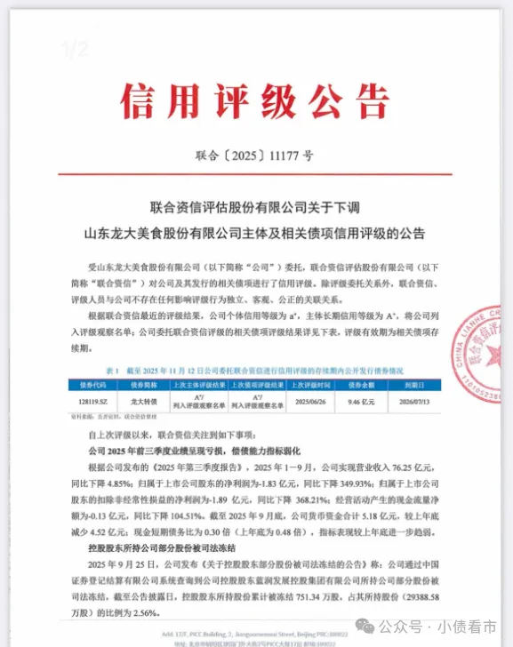 公告显示,此次调整基于龙大美食2025年前三季度业绩亏损、偿债能力弱化及控股股东部分股份被司法冻结等因素。