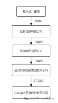 从股权结构看,龙大美食的控股股东为蓝润发展控股集团有限公司,持股比例为27.23%,戴学斌、 董翔夫妇为公司实际控制人。