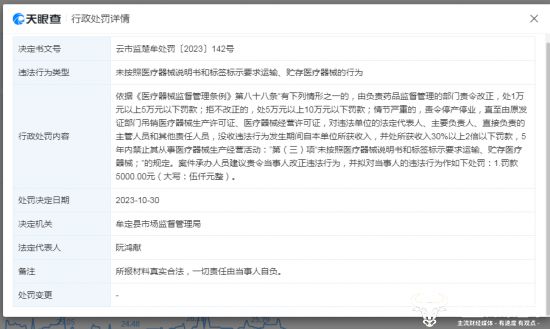 值得一提的是,据行政处罚决定书云市监楚牟处罚〔2023〕142号显示,一心堂因未按照医疗器械说明书和标签标示要求运输、贮存医疗器械行为,构成为违法违规,被牟定县市场监督管理局在10月30日罚款了5千。