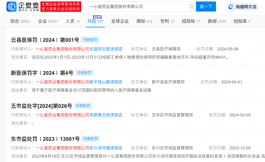 企查查数据显示,2023年12月以来,一心堂旗下连锁店多次遭行政处罚,处罚原因包括将不属于医疗保障基金支付范国的医药费用纳入医疗保障基金结算、给职工参保人超量开药。