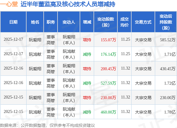 一心堂:12月17日高管阮鸿献减持股份合计176.14万股