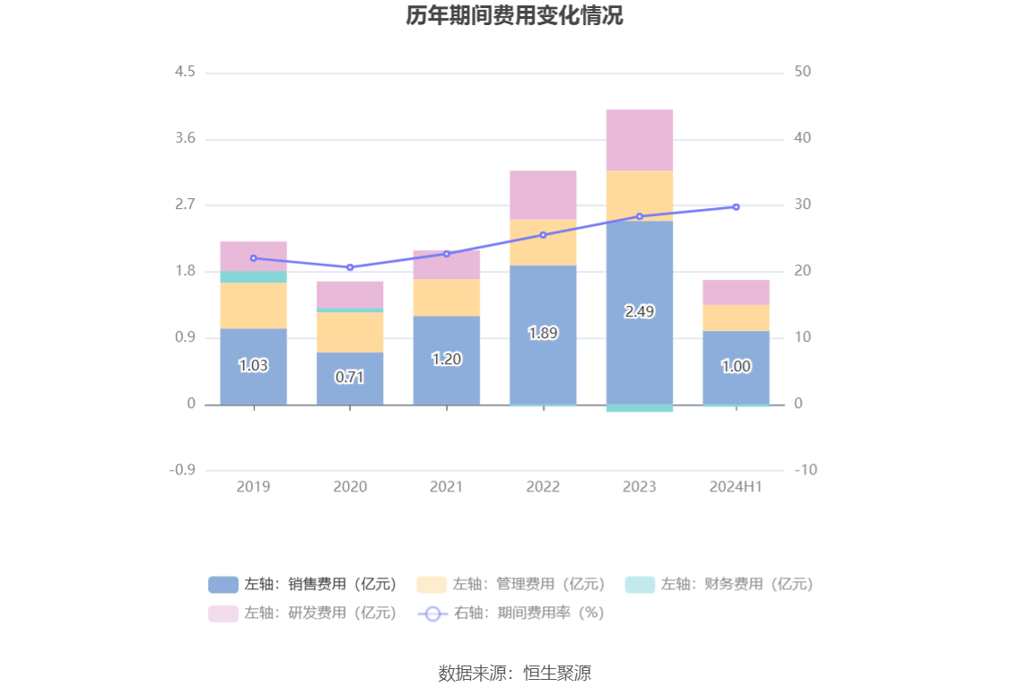 2024年上半年,公司期间费用为1.66亿元,较上年同期减少1772.40万元;但期间费用率为29.76%,较上年同期上升0.53个百分点。其中,销售费用同比下降8.19%,管理费用同比下降2.77%,研发费用同比下降18.67%,财务费用由去年同期的-310.02万元变为-313.57万元。