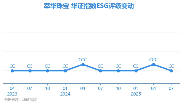 日前,华证指数公布了新一期(2025年7月31日)的ESG评级结果,萃华珠宝(002731.SZ)获得CC评级(华证指数评级为C起至AAA九档,C为最低档,AAA为其最高一级评级/AA为其第二档),上一期(2025年4月30日)ESG评级为CCC。本期ESG评级在116家纺织品、服装与奢侈品行业A股上市公司中排名第96(上一期排名第87)。