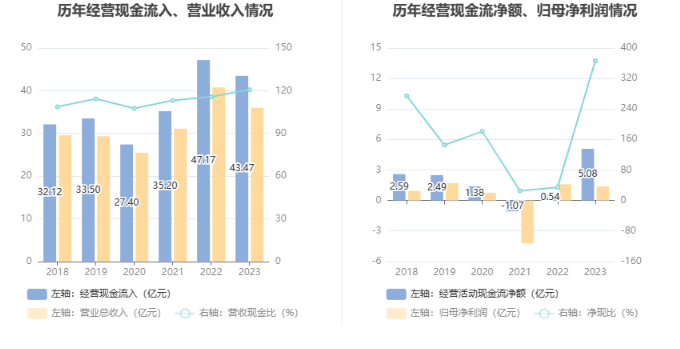 2023年,公司经营活动现金流净额为5.08亿元,同比增长836.08%;筹资活动现金流净额-2.69亿元,同比减少1.51亿元;投资活动现金流净额-287.34万元,上年同期为1.17亿元。