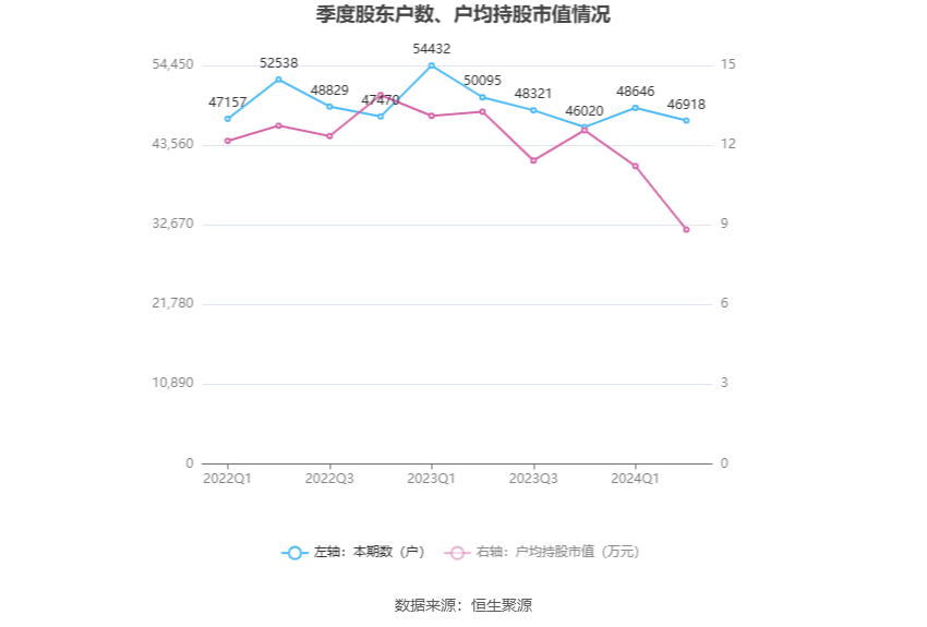 筹码集中度方面,截至2024年上半年末,公司股东总户数为4.69万户,较一季度末下降了1728户,降幅3.55%;户均持股市值由一季度末的11.21万元下降至8.82万元,降幅为21.32%。